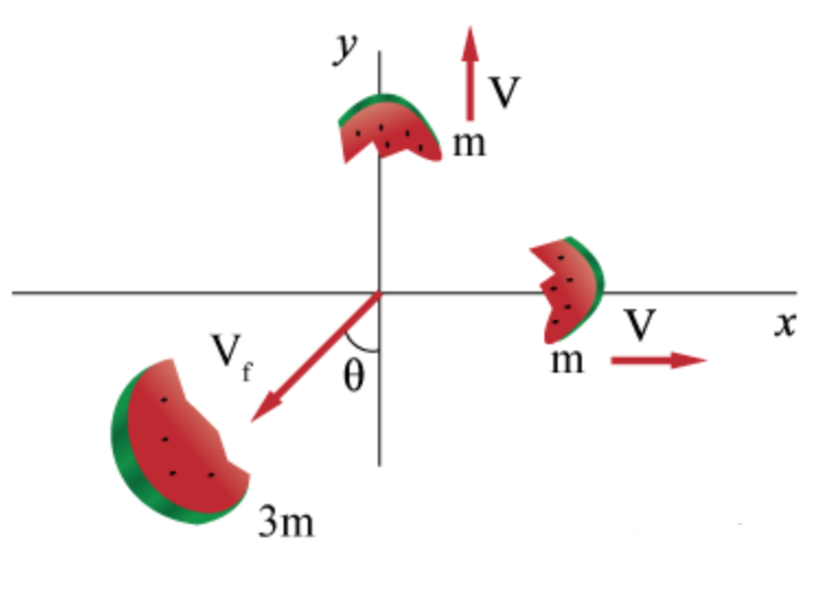 Both of these pieces fly away with a speed of V 38 ms. A watermelon is blown into three pieces by a large firecracker. Two pieces of equal mass m fly away perpendicular to one another one in the x direction another in the y direction.